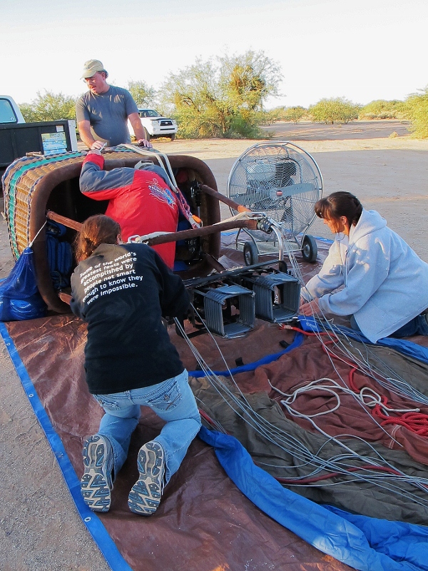 This is a job I usually do, holding open the throat of the balloon while the fan blows it full of air.