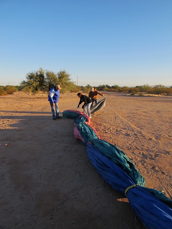 The ground is dry enough and weed free enough that Dan Ewer, pilot of Foolish Pleasure Hot Air Balloon Rides, has decided we can lay out the balloon envelope without putting down a tarp.