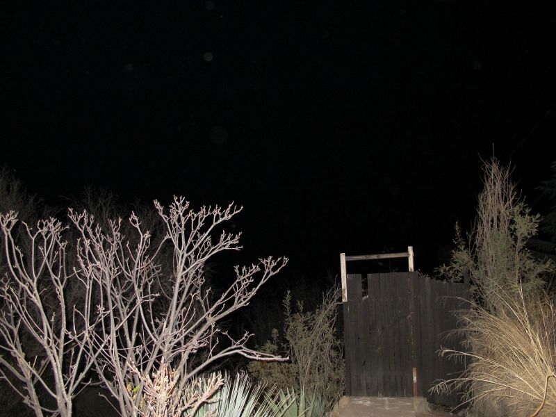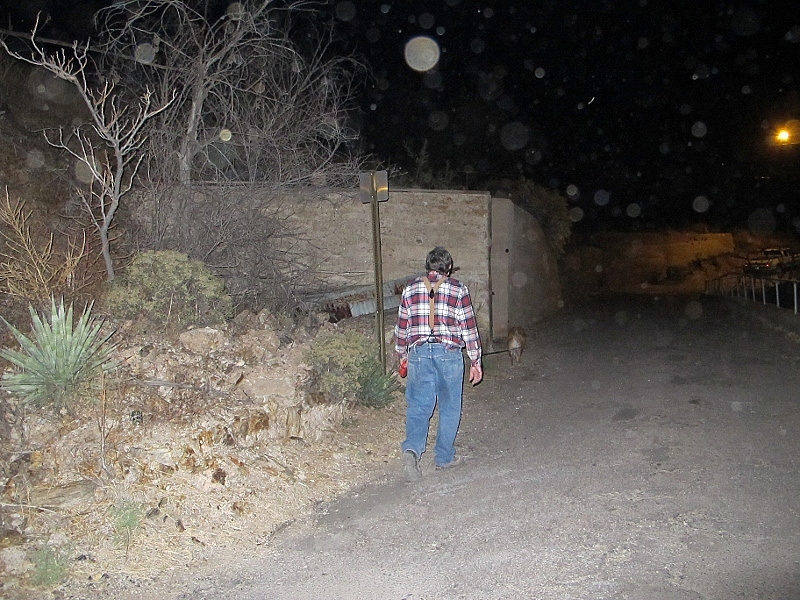 Last night was cold in Bisbee, Arizona. Some of yesterday’s snow was still on the ground and I’m glad my jeans are baggy enough to accommodate long underwear. Because now that the world has ended and begun again, there are still some routines that must be done, like walking the dog at night. For a quester of orbs this is prime time to see who’s in the neighborhood.